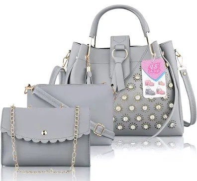 This elegant and versatile 3-Piece Grey Handbag Set offers coordinated style and functionality for every occasion. The centerpiece is a large tote or satchel bag in a structured faux leather, featuring eye-catching front panel embellishments: perforated sunburst cutouts accented with sparkling metallic studs. This main bag has both sturdy top handles and a long, detachable shoulder strap. Complementing the tote are a practical medium sling bag with a zipper closure and a charming small pouch or clutch. The pouch is finished with a scalloped flap and a fashionable gold-toned chain strap. United by their chic grey color and rich gold-toned hardware, this set is perfect for transitioning effortlessly from a professional workday to an evening out.