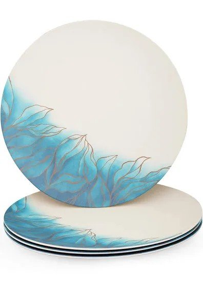 This striking Set of Decorative Dinner Plates brings a touch of artistic, coastal elegance to your table. Crafted with a smooth, durable finish (likely ceramic or melamine), each plate features a vibrant, unique design. The base is a clean, creamy white, which contrasts beautifully with the watercolor-style wash of vibrant blue and turquoise that sweeps across one side. This colored area is overlaid with an abstract, flowing leaf or petal motif, delicately outlined in a shimmering metallic copper or light gold accent. The modern, round shape is perfect for showcasing your culinary creations, making this set ideal for stylish everyday dining or special occasions.