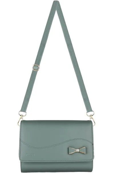 This stylish and compact Crossbody Sling Bag is perfect for everyday use or casual outings. It features a sleek, rectangular design with a flap-over closure, crafted from a smooth, soft-touch material, likely faux leather, in a fashionable pastel sage green color. The front flap is accented with a delicate, curved stitched line and adorned with a charming small metallic gold-toned bow, adding a touch of feminine elegance. The bag is completed with a thin, color-matched, adjustable strap, allowing it to be comfortably worn across the body or draped over the shoulder. Its minimalist yet chic design makes it a versatile accessory for carrying essentials like a phone, keys, and wallet.