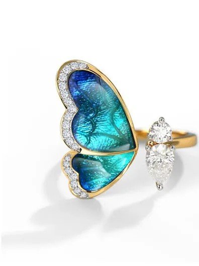 This breathtaking statement ring is an artistic masterpiece, showcasing an elegant and whimsical butterfly design. The ring features a unique bypass style, with a beautifully rendered butterfly wing on one end and a cluster of brilliant diamonds on the other. The butterfly wing is a work of art in itself, crafted with vibrant enamel that fades from a deep blue to a radiant turquoise, complete with delicate, lifelike veining. The wing’s edge is meticulously lined with shimmering, pavé-set diamonds, adding a brilliant sparkle. On the opposite side, two stunning pear-cut diamonds are stacked to complete the open design, creating a perfect balance. The band is crafted from a warm, polished yellow gold, which provides a rich backdrop for the colorful enamel and sparkling diamonds. This exquisite ring is a perfect expression of unique style and is sure to draw admiration.