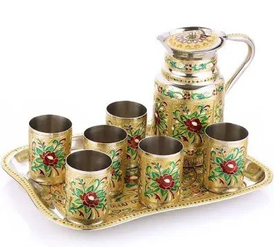 This magnificent Traditional Enamel-Painted Serving Set is a stunning example of artisanal metalwork. The set comprises a pitcher, six matching tumblers, and a decorative serving tray, all crafted from a durable metal (likely brass or brass-plated steel). The entire collection is lavishly decorated with intricate Minakari enamel painting in a rich color palette of red and green over a dazzling metallic gold finish. The detailed floral and foliage patterns that cover every piece give the set a distinctly regal and antique aesthetic. Perfect for special occasions, cultural celebrations, or simply as a luxurious display piece, this drinkware set beautifully blends traditional craftsmanship with functional elegance.