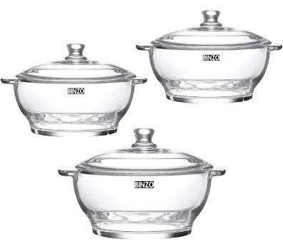 This is a practical and elegant Set of 3 Binzo Glass Serving Bowls with Lids, perfect for any kitchen and dining table. Crafted from durable, clear, heat-resistant glass, these bowls are ideal for everything from preparing a meal to serving it directly. Each bowl features a classic round silhouette with two small side handles for secure transport, and a matching glass lid topped with a convenient knob. The transparent design allows you to easily monitor cooking and beautifully showcase layered salads, baked dishes, or individual casseroles at the dinner table. This versatile set is an essential upgrade for serving, storing, and cooking.
