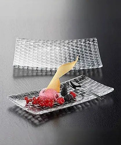 This elegant and contemporary Rectangular Glass Serving Dish is designed to elevate any culinary presentation. Crafted from clear, durable glass, the dish features a striking, embossed woven texture that runs across its entire surface, adding sophistication and reflecting light beautifully. Its long, narrow, rectangular shape is perfect for individual servings of desserts like the pictured sorbet and fresh berries, or for stylishly plating appetizers and small bites. Sold here in a set of two, these versatile platters are an essential addition to any modern table setting, ensuring your food is presented as beautifully as it tastes.